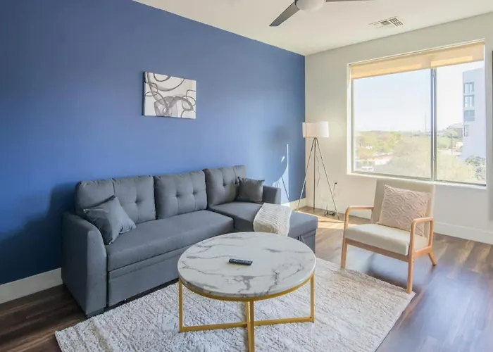 The 71 ft² Beautiful 1Bd - Pool, Gym, Parking, W-D - Sleeps 4 Apartment Tempe is located 2.1 miles from the Desert Rio Salado River Park and just 10 minutes' walk from Jaycee City Park. This 1-bedroom apartment features Wi-Fi throughout the property.